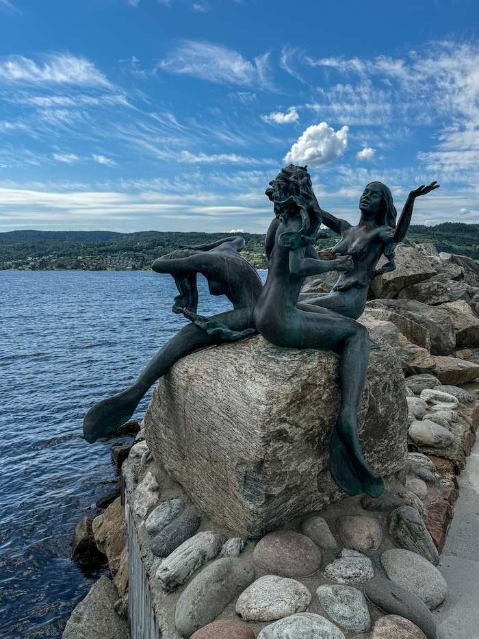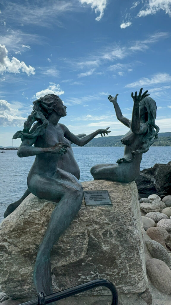 There’s family friendly fun at the Follo museum (a short walk from the town center) and the aquarium (located minutes from the square). If you want to swim, Skiphellebukta and Elleodden is located south of the center of Drøbak. The family beach has a long shallow sandy beach, a large lawn and several rocks where you can sit and sun. And you don’t want to miss the Christmas House and Santa’s post office. The yellow wooden house on the square is the Nordic region’s only year-round Christmas house. In Drøbak harbor you will also find the Santa Claus traffic sign, right outside the Tourist Information Office (sadly, we missed this). What we didn’t miss was the three lively mermaid statues by the marina.
