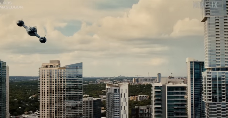 You can also see the “Jenga” building in an aerial shot of downtown Austin in the trailer. And, of course, all the scenes requiring sets and special effects were shot at Rodriguez’s studios on Old Manor Road.