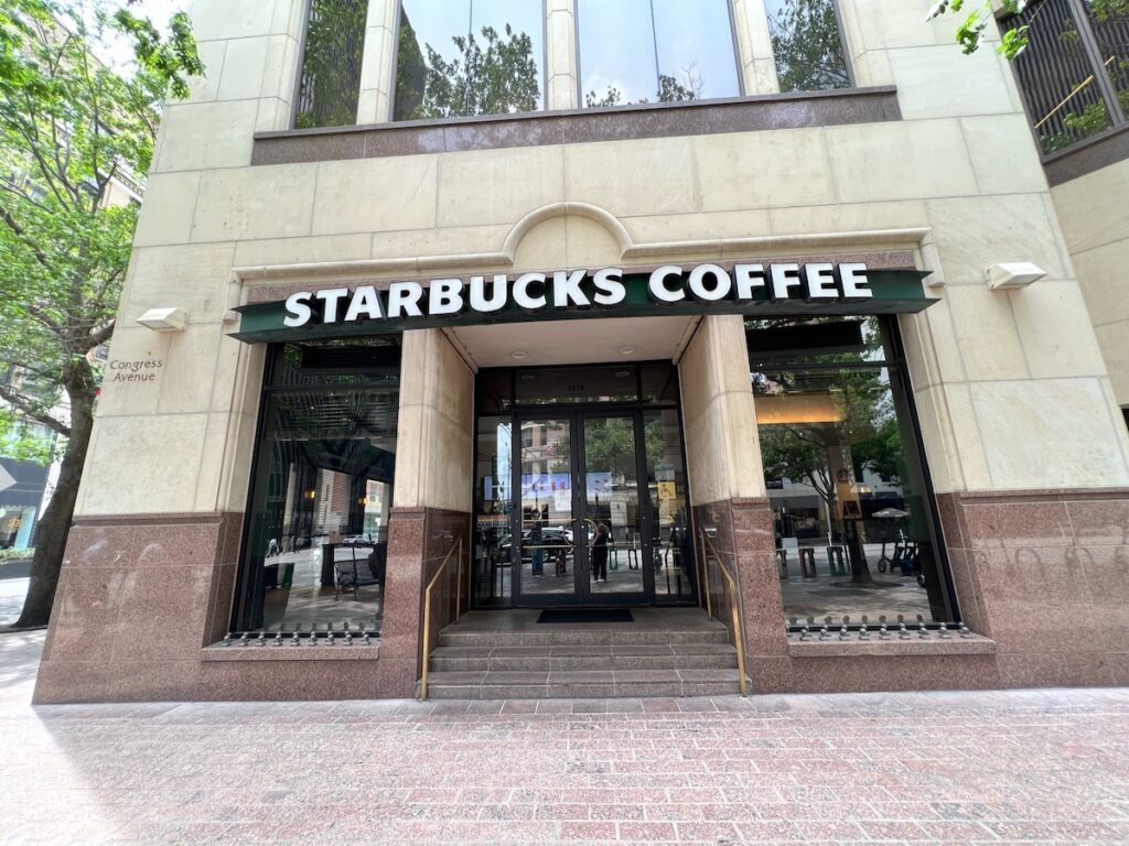 The Starbucks where Gracie races in her patrol car and then cuts the line while flashing her badge is located at the corner of 6th Street and Congress Ave. You can see the old downtown Schlotzsky’s Deli across the street. Sadly, this Starbucks closed in 2022.