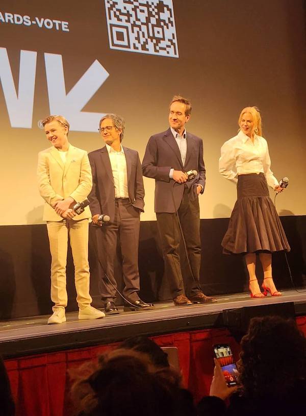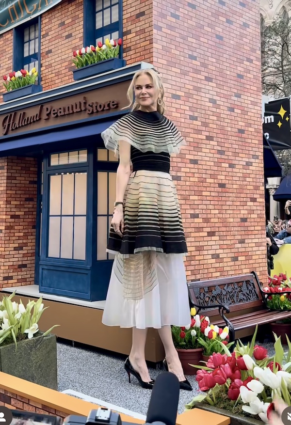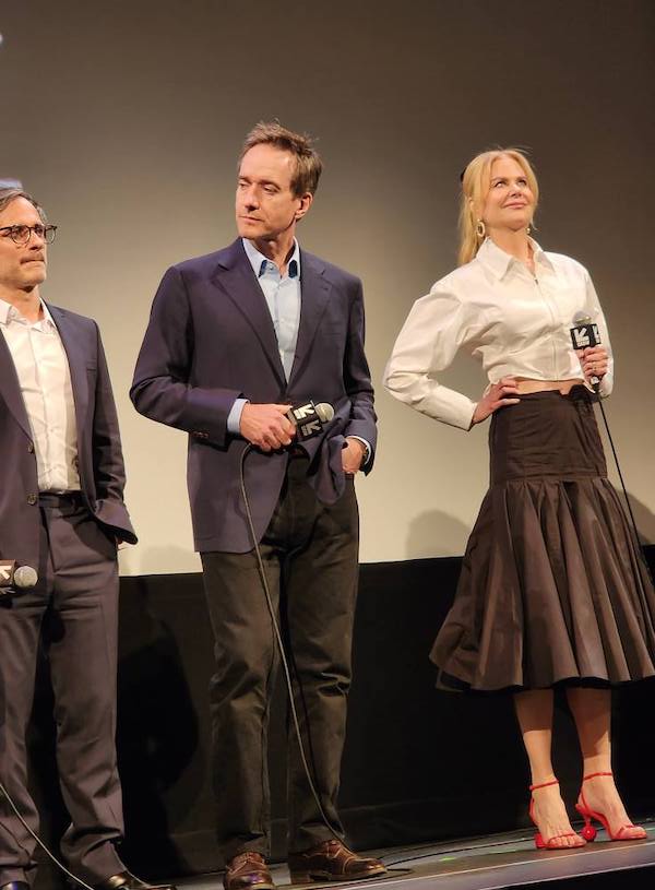 At the Holland premiere, Nicole Kidman stunned in a striped look from a 2008 Fendi collection. She was joined by co-stars Matthew Macfadyen and Gael García Bernal, whom we crossed paths with earlier in the day in the lobby of the Four Seasons. Kidman changed into a second ensemble for the Q&A after the film, pictured below, which included a pair of red The Bisou sandals from Jacquemus.