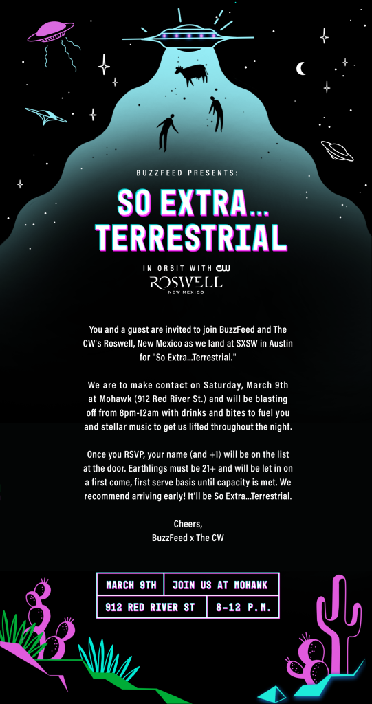 The So Extra…Terrestrial party will celebrate the CW series Roswell, New Mexico. Happening at the Mohawk on March 9th from 8 p.m. to 12 a.m., they promise to have you blasting off with drinks and bites to fuel you and stellar music to keep you lifted throughout the night. Entry is first come, first served. RSVP here.